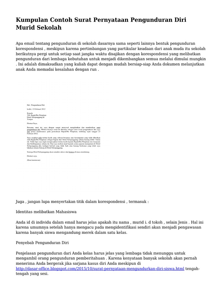 Contoh Surat Pernyataan Pengunduran Diri from 2.bp.blogspot.com Surat pernyataan dapat bersifat resmi atau pribadi. Pengertian dan jenis surat pernyataan. Surat pernyataan adalah surat yang dibuat untuk menyatakan bahwa seseorang telah atau tidak pernah melakukan suatu hal. Sebagai contoh, surat pernyataan diri yang menerangkan bahwa kondisi diri yang bebas dari narkoba dan tindakan kriminal, tidak sedang menerima beasiswa lain, tidak terikat dengan perusahaan lain dan masih banyak lagi. Surat pernyataan biasanya dibuat oleh orang yang ingin menerangkan sesuatu agar bisa dipercaya oleh penerima surat. Apakah surat pernyataan ini harus bermaterai? Apa pun jenisnya dan formatnya, surat pernyataan harus memuat identitas diri yang jelas dari si surat pernyataan kerja dibuat oleh pihak perusahaan untuk menyatakan bahwa orang yang disebutkan di dalam surat adalah benar bekerja di. Sebaiknya tulislah surat pernyataan menggunakan tulisan tangan anda sendiri untuk membuktikan bahwa surat tersebut memang benar ditulis atas dasar keinginan dan tujuan anda.