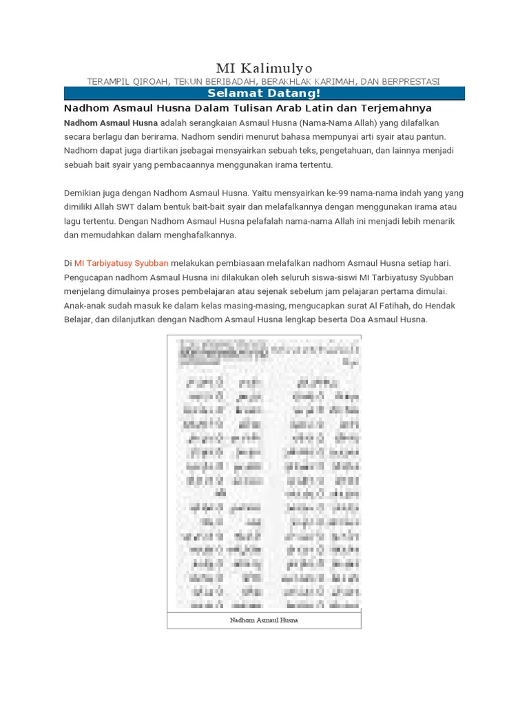 Nadhom Asmaul Husna Pdf Contoh Makalah from imgv2-2-f.scribdassets.com Bacaan asmaul husna sendiri berjumlah 99 dan kesemuanya memiliki makna dan arti yang indah serta sebagai bukti akan kebesaran allah swt. Berikut ini bunyi nadhom tersebut baik dalam tulisan arab dan latin yang sekaligus dilengkapi dengan terjemahannya. Mari kita belajar memahami tulisan latin asmaul husna. Oleh karena itu dipersembahkan teks asmaul husna nama nama allah ini untuk menjadi pedoman. Selain mendapatkan pahala, membaca asmaul husna dapat memberikan ketenangan, kedamaian, dan. Teks latin asmaul husna mp3 & mp4. Di samping teks dalam bahasa arab, tersedia juga dalam tulisan latin dan terjemah, serta dilengkapi dengan doa asmaul husna. Download teks asmaul husna dan artinya berbagai teks penting.
