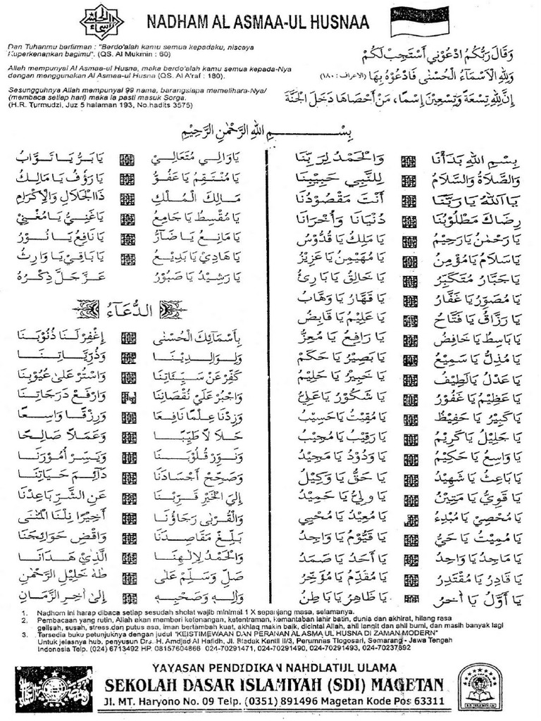 Teks arab dan teks latin asmaul husna menjadi pegangan saat sedang tidak hafal. Related to teks asmaul husna. Teks nadhom asmaul husna latin arab dan terjemah indonesia yang berjumlah 99 nama asma allah. Berikut ini bunyi nadhom tersebut baik dalam tulisan arab dan latin yang sekaligus dilengkapi dengan terjemahannya. Oleh karena itu dipersembahkan teks asmaul husna nama nama allah ini untuk menjadi pedoman.